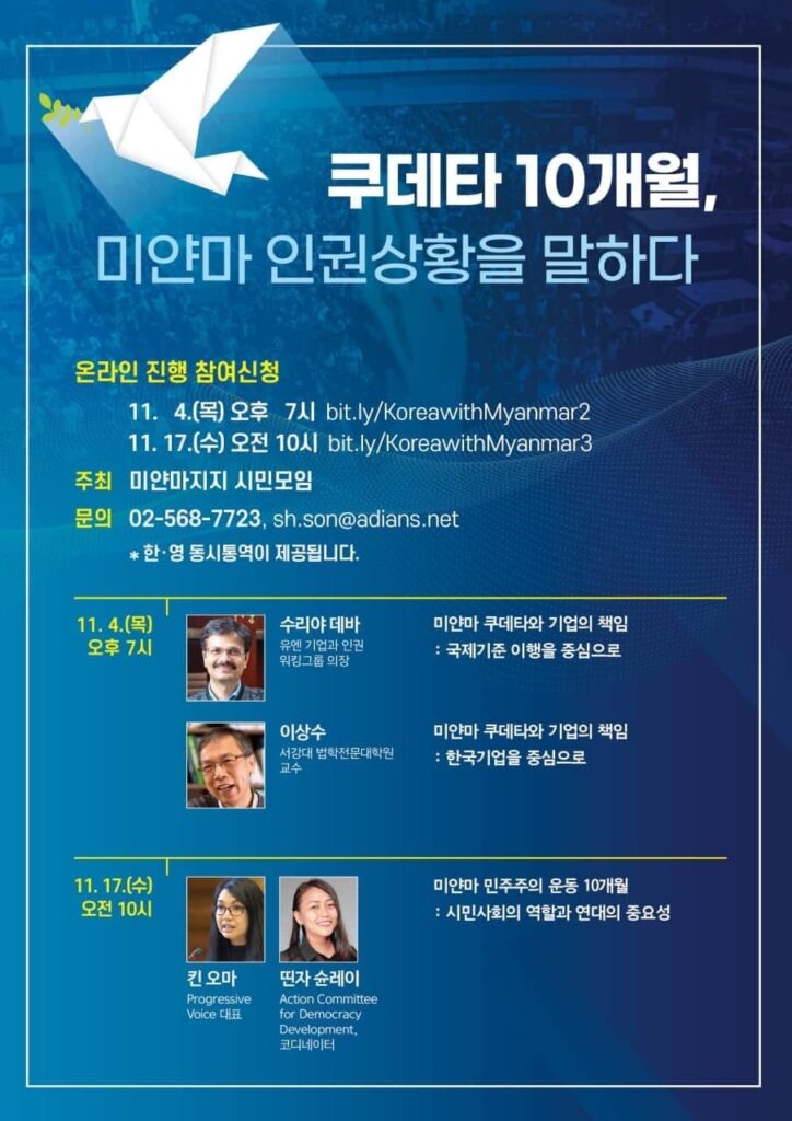 [미얀마지지 시민모임] 쿠데타 10개월, 미얀마 인권상황을 말하다 – 연속 강연 개최 (11/4, 11/17 온라인)