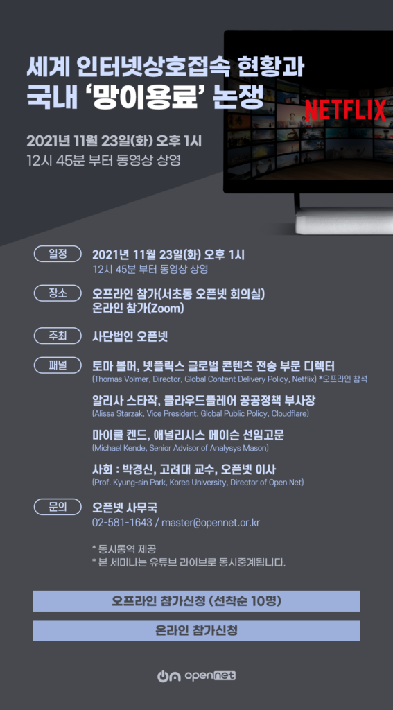 넷플릭스의 글로벌 콘텐츠 전송 부문 디렉터 토마 볼머(Thomas Volmer, Director of Global Content Delivery Policy)가 오프라인으로 참석합니다. 그리고 전 세계 웹사이트의 5개 중의 4개를 서비스하고 있다는 CDN회사 클라우드플레어(Cloudflare)의 공공정책 부사장 알리사 스타작(Alissa Starzak, Vice President, Global Public Policy), 전 세계 인터넷상호접속의 대가이자 작년에 한국 상황에 대해 보고서를 쓴 바 있는 애널리시스 메이슨의 선임고문 마이클 켄드(Michael Kende, Senior Advisor, Analysys Mason)를 모시고 이야기를 들어보겠습니다.