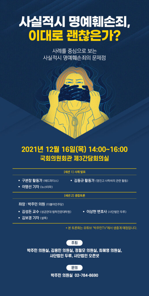 사단법인 오픈넷이 박주민 의원실, 김용민 의원실, 정필모 의원실, 최혜영 의원실, 사단법인 두루와 공동으로 12월 16일(목) 14시 국회의원회관 제3간담회의실에서 ‘사실적시 명예훼손죄, 이대로 괜찮은가? – 사례를 중심으로 보는 사실적시 명예훼손죄의 문제점’을 주제로 한 토론회를 개최한다.