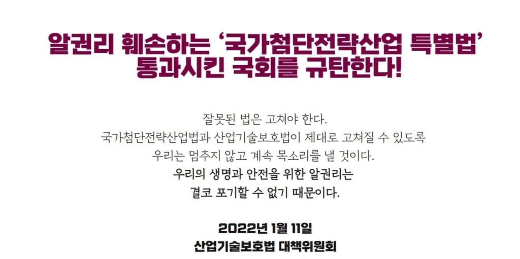 [보도자료] [산기법대책위] ‘국가첨단전략산업 특별법’ 중단! 개악 ‘산업기술보호법’ 개정 촉구 시민사회 연서명 (2022.01.05.)