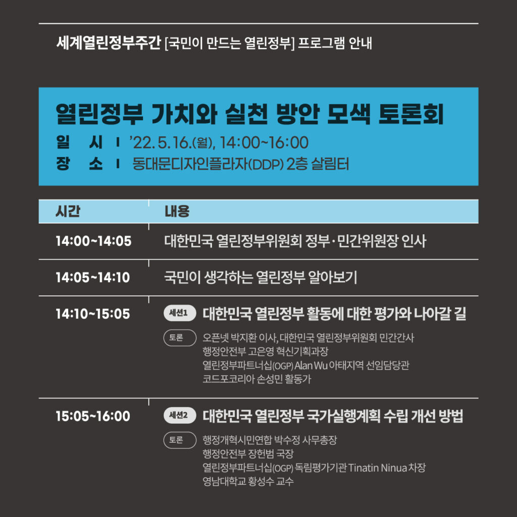16일(월) 14:00-16:00, 「열린정부 가치와 실천 방안 모색 토론회」에서는 정부·시민사회·학계·청년뿐만 아니라 국제협의체도 참여해 대한민국 열린정부 활동에대한 평가와 나아갈 길을 논의하고, 대한민국 열린정부 국가실행계획 수립 개선 방법을 모색합니다.
