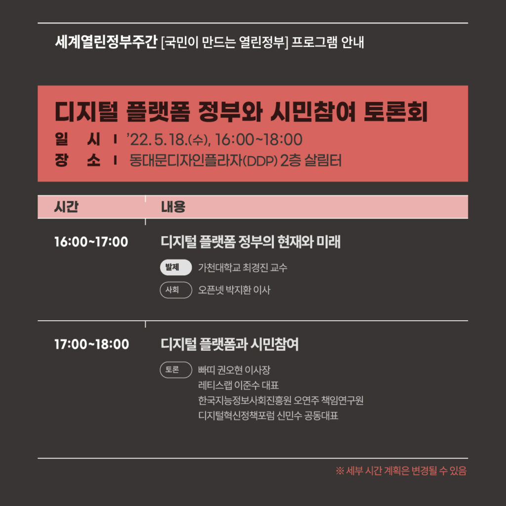 열린정부위원회에 민간위원으로 참여하고 있는 사단법인 오픈넷은 2022년 5월 16일(월)부터 5월 20일(금)까지 개최되는 <세계 열린정부주간 국민이 만드는 열린정부> 행사를 공동 주관합니다.