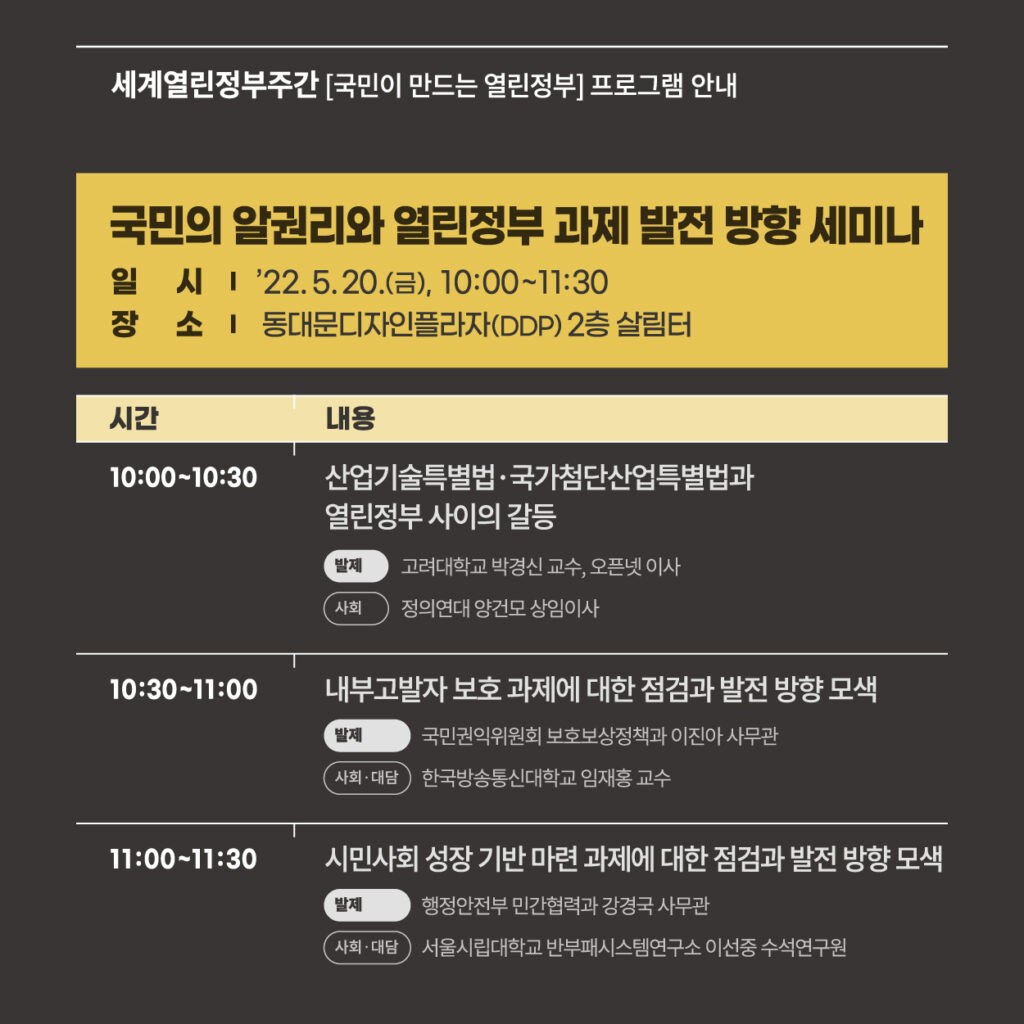 20일(금) 10:00-11:30, 「국민의 알 권리와 열린정부 과제 발전 방향 세미나」는 반부패 분과가 기획하였고 국민권익위원회 내부고발자 보호, 행정안전부 시민사회 성장 기반 마련 과제 이행 현황과 발전 방향에 대해 임재홍 한국방송통신대학교 교수, 이선중 서울시립대학교 반부패시스템연구소 수석연구원이 논의하고, 산업기술·국가첨단산업특별법과 열린정부 간 갈등을 주제로 박경신 고려대학교 교수(오픈넷 이사)가 발제를 맡습니다.