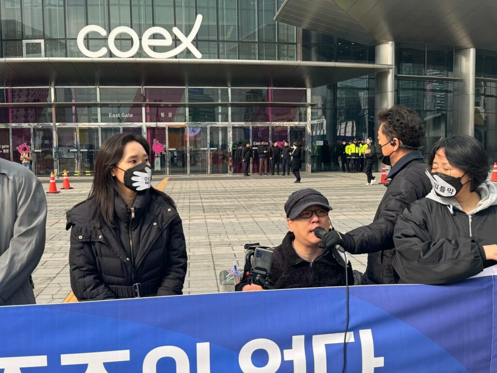 사소한 얘기 하나하면, 윤석열 정부와 경찰들의 꼼수입니다. 보통 집회나 기자회견을 가로막는 것은 전경차입니다. 그런데 이번에는 민주주의의 외양으로 보이고 싶었는지 전경차가 아니라 봉고차로 가렸습니다. 멀리서 보면 경찰차가 드러났을 때 ‘한국사회는 굉장히 민주적이지 않구나’라고 여길 수 있으니까요. ‘집회 시위가 보장되지 않는 것’이 시각적으로 감각적으로 느껴지는 것을 차단하기 위한 꼼수인 것이지요