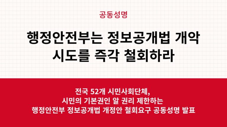 우리 시민사회단체들은 행정안전부가 입법예고한 정보공개법 개정안(행정안전부 공고 제2024-1114호)에 대해 심각한 우려를 표명하며, 이를 즉각 철회할 것을 강력히 요구한다. 이번 개정안은 시민의 알 권리를 심각하게 제한하고 정부의 투명성을 훼손할 수 있는 위험한 조치이다.