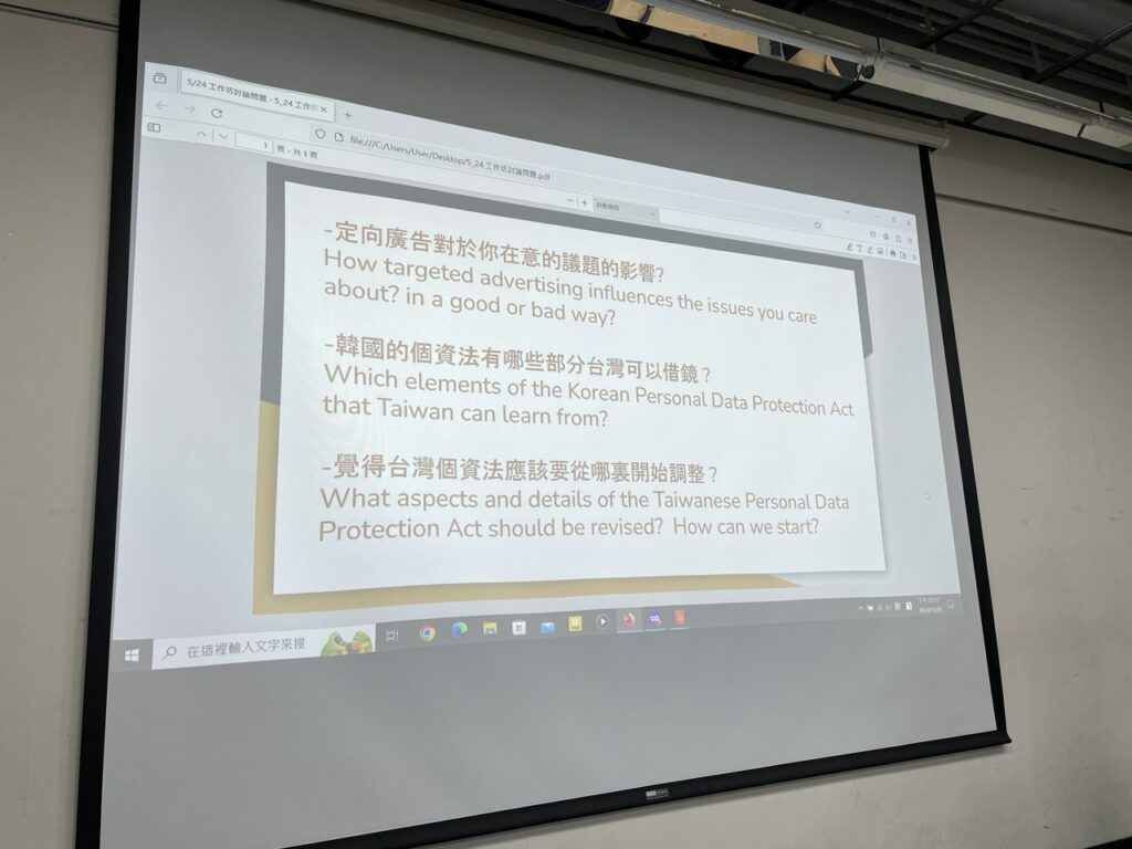 수초우대학교에서 공개로 진행된 이번 워크숍에서 윤홍기 연구원은 명시적 동의 없이 이용자의 개인정보를 수집한 메타에 한국의 개인정보보호위원회가 벌금을 부과한 사례를 발표했다. 박경신 이사는 타게팅 광고와 관련된 개인정보보호법의 개념을 설명했다.국립대만대학교의 수 후이-치에 교수는 대만 개인정보보호법의 개정 내용과 주의점, 법의 세부 사항에 대해 설명해다. 발표가 끝난 후 청중들과 그룹 토론을 진행해 이 문제를 더욱 깊이 이해하는 시간을 가졌다.