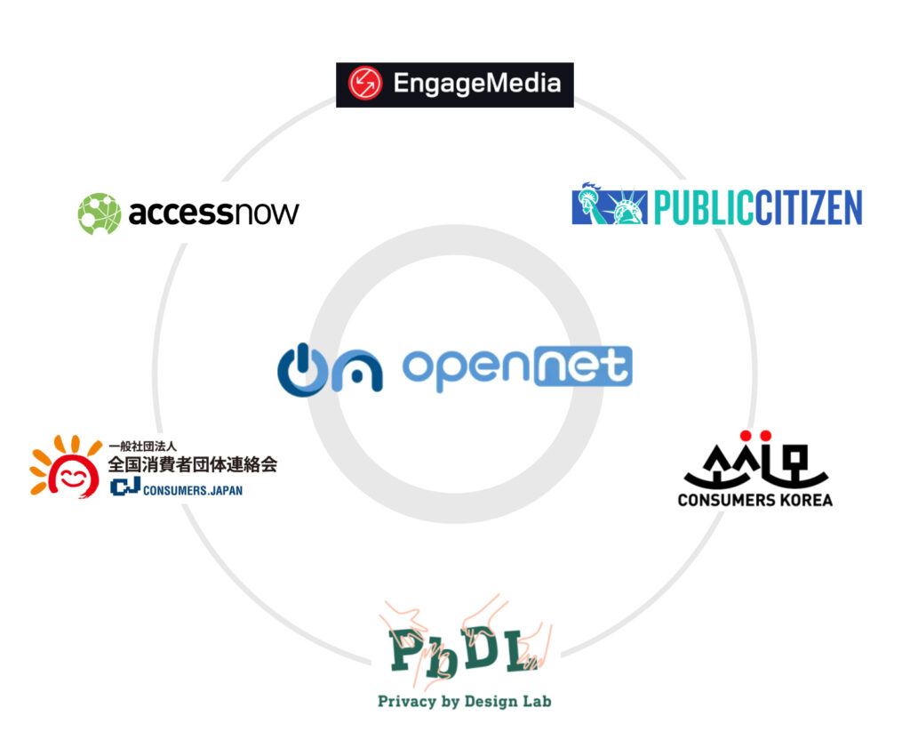– 공동주최: www.opennetkorea.org, www.accessnow.org, www.shodanren.gr.jp, www.engagemedia.org, www.consumerskorea.org, www.privacybydesign.jp, www.citizen.org; 히로시 미야시타(주오대학교), 하비에르 루이즈 디아즈(포용통상정책센터)