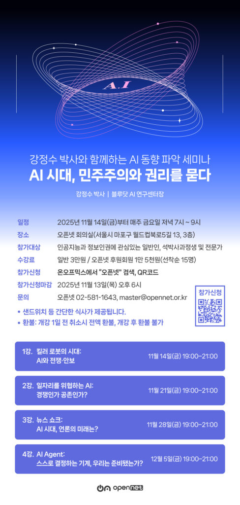 사단법인 오픈넷이 11월 14일부터 매주 금요일 저녁 7시, 4회에 걸쳐 강정수 박사와 함께 인공지능의 최신 동향을 파악하는 세미나를 개최합니다. 이번 세미나는 급격히 변화하는 인공지능 기술이 사회와 민주주의 그리고 우리의 권리 환경에 어떤 영향을 미칠지 탐구해보는 자리로, 강의와 토론을 통해 AI 기술을 비판적으로 조망하며, 변화하는 환경 속에서 우리가 지켜내야 할 디지털 권리와 기술의 공공성을 모색하고자 합니다.