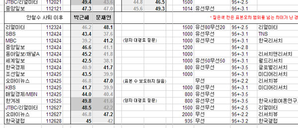 뿐만 아니라, 보시다시피 나는 여론 조사 기관들이 제시한 해당 사항들을 되도록 빠짐없이 모두 담아 정리하고 있다.