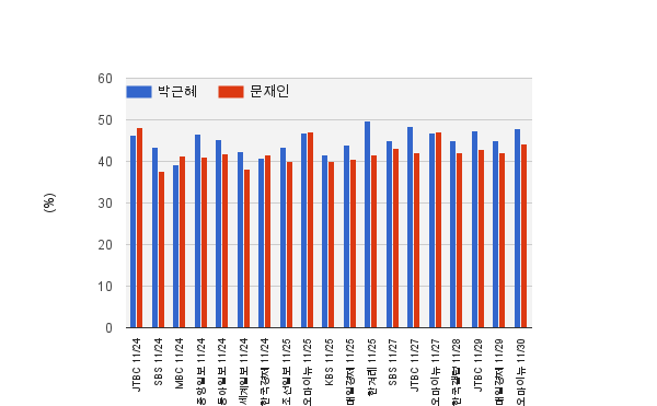 여러 언론사나 여론 조사 회사에서 내놓은 대통령 선거 후보자 지지율이다. 한 달 전인 10월 중순부터 11월 초부터 가장 최근 것까지이다.