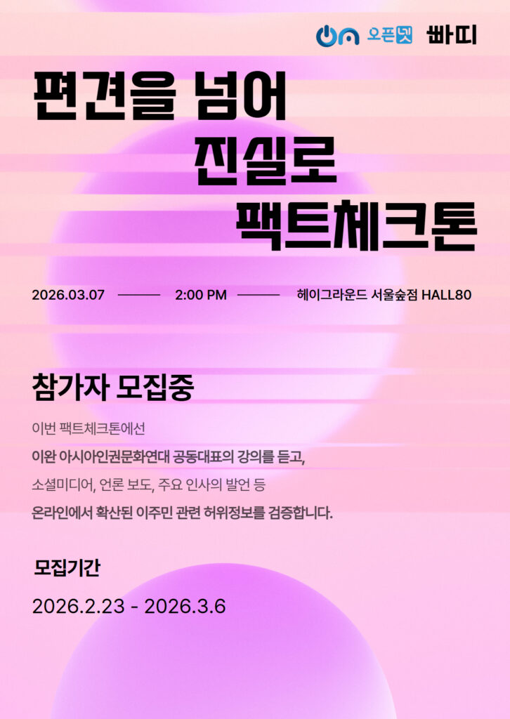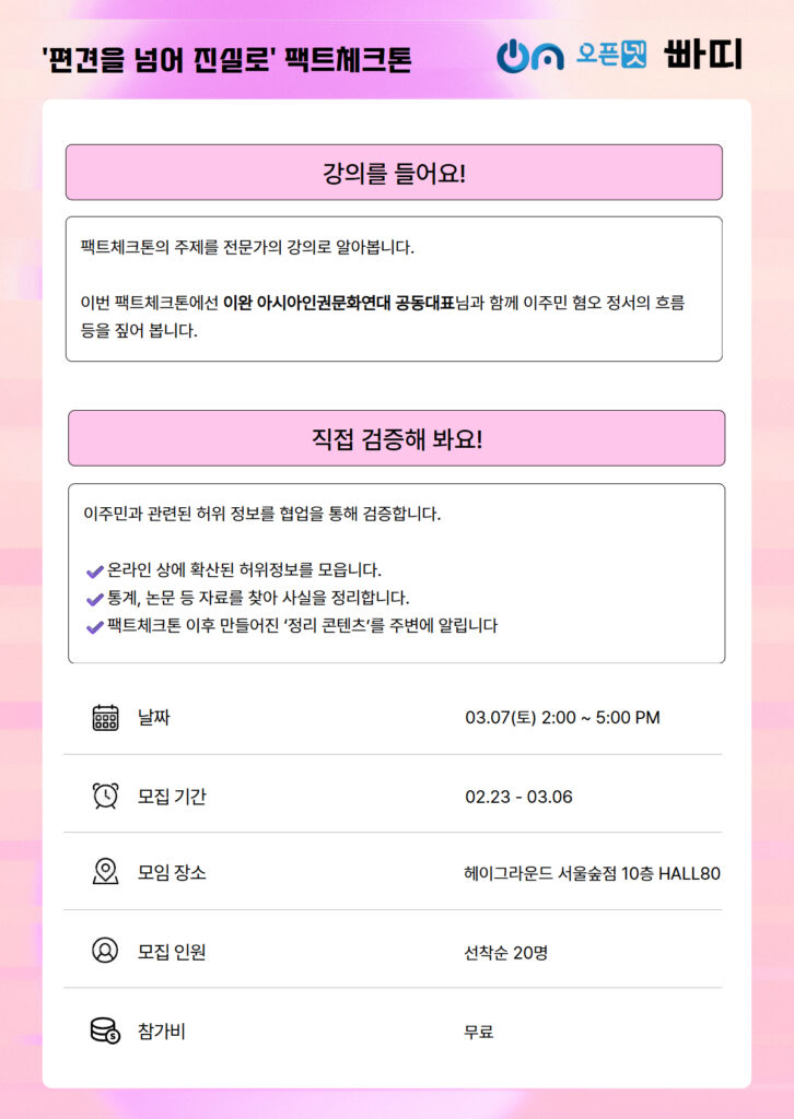 📍이번 팩트체크톤은 오픈넷과 빠띠가 시민과 함께 소셜미디어, 커뮤니티, 언론 등 온라인에 확산된 이주민 관련 허위정보를 모으고, 검증합니다.
