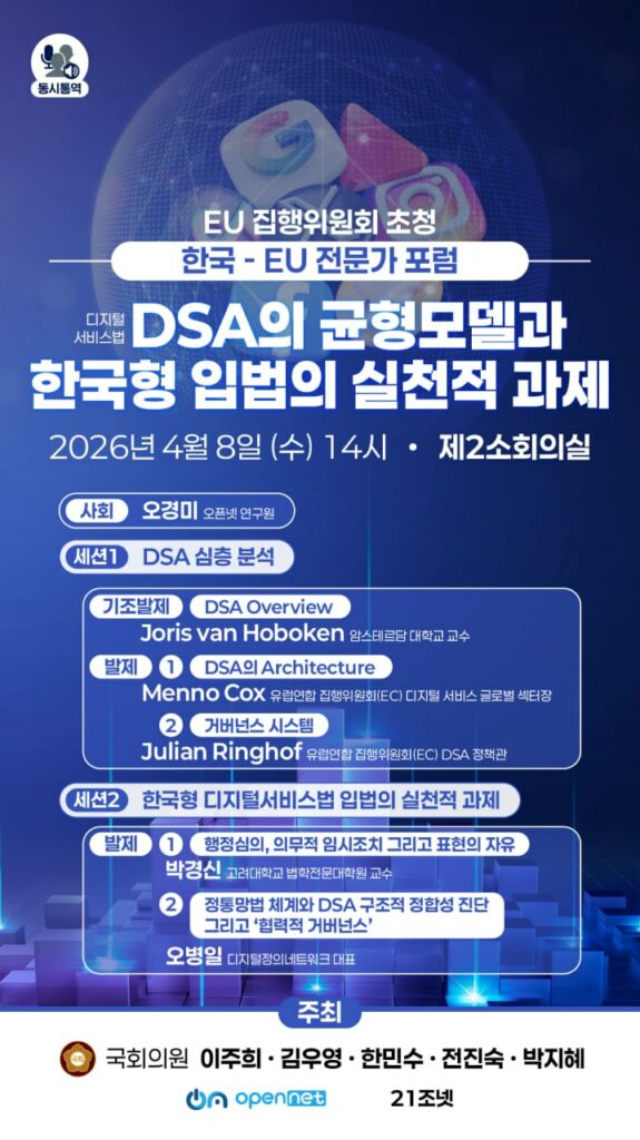 이러한 취지에 발맞추어, EU 디지털 서비스법(DSA) 전문가 및 실무 담당자들과 한국의 정책 입안자 및 국회의원, 시민사회가 한자리에 모이는 공론의 장을 마련하고자 합니다. 본 토론회에서는 DSA가 표현의 자유와 정보의 건전성, 나아가 혁신과 권리보호 사이의 균형을 어떻게 구현하려 하는지 살피고, 이러한 유럽의 경험을 한국적 상황에 창의적으로 적용할 방안을 모색할 것입니다. 특히 2025년 한국 국회가 온라인 허위 정보 대응 입법의 핵심 참조 모델로 DSA를 주목하기 시작했기 때문에(예: “허위조작근절법”) 더욱 이 논의는 시의적절합니다. 다만, DSA를 우리 법제에 의미 있게 이식하기 위해서는 이 법이 채택된 세계적·역사적 배경은 물론, 유럽 시민들의 디지털 소통 환경에 미치는 실질적인 영향력, 그리고 한국의 기존 온라인 콘텐츠 규제 체계와의 구조적 차이점을 심도 있게 고찰해야 합니다. 이번 세미나는 한국 사회가 관련 입법 제안들을 객관적으로 평가하는 데 기여할 뿐만 아니라, 한국 전문가들이 한국의 규제 환경에 대해 논의함으로써 EU 외교관들이 EU와 한국이 협력하여 기술을 인권에 활용하고 인권이 기술을 강화하는 방안을 모색하는 데에도 도움이 될 것입니다.
