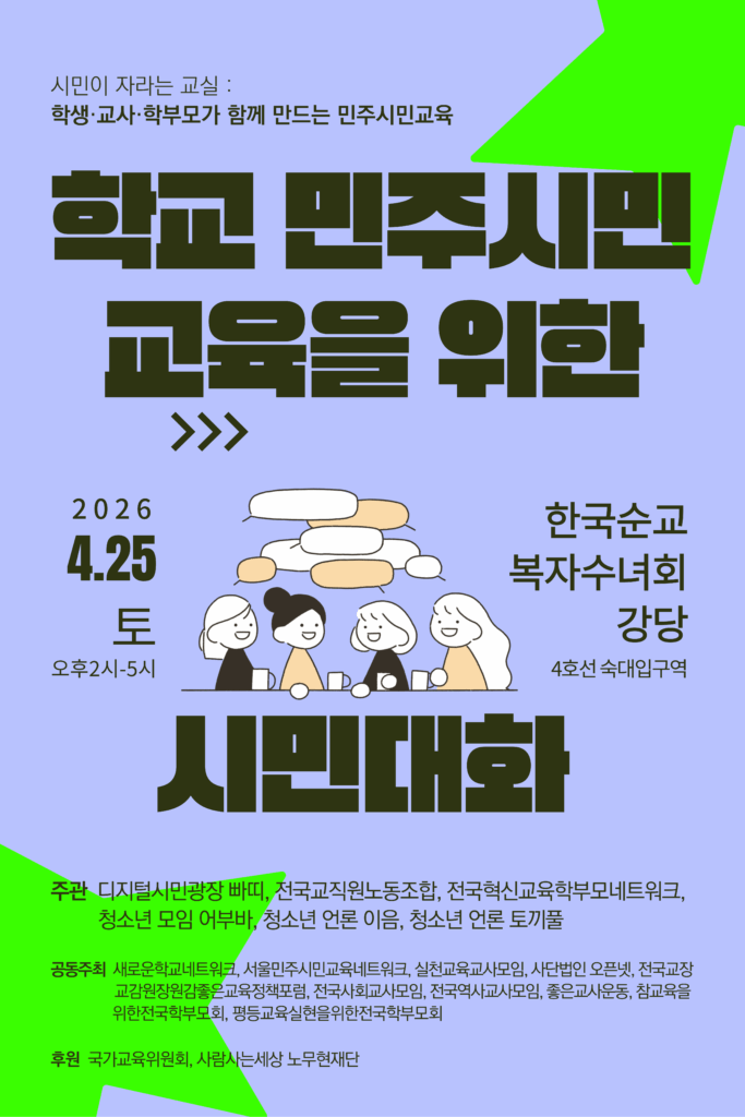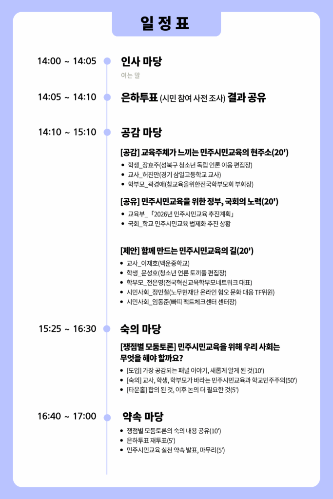 학교 민주시민교육의 현주소를 진단하고 청소년단체, 교원단체, 학부모단체, 시민사회단체가 함께 실천 약속을 만드는 뜻깊은 자리입니다. 공감 마당에서는 교육 주체들이 현장에서 체감하는 생생한 목소리를 듣고, 정부와 국회의 입법 현황을 공유하며 서로의 제안을 경청합니다. 이어지는 숙의 마당에서는 쟁점별 모둠 토론을 통해 학교 민주주의에 대한 서로의 바람을 확인하고, 합의된 지점과 향후 과제를 구체적으로 정리합니다. 이번 만남은 단순한 의견 공유를 넘어, 교육 현장의 실질적인 변화를 이끌어낼 단단한 실천적 토대를 마련하는 소중한 발걸음이 될 것입니다.